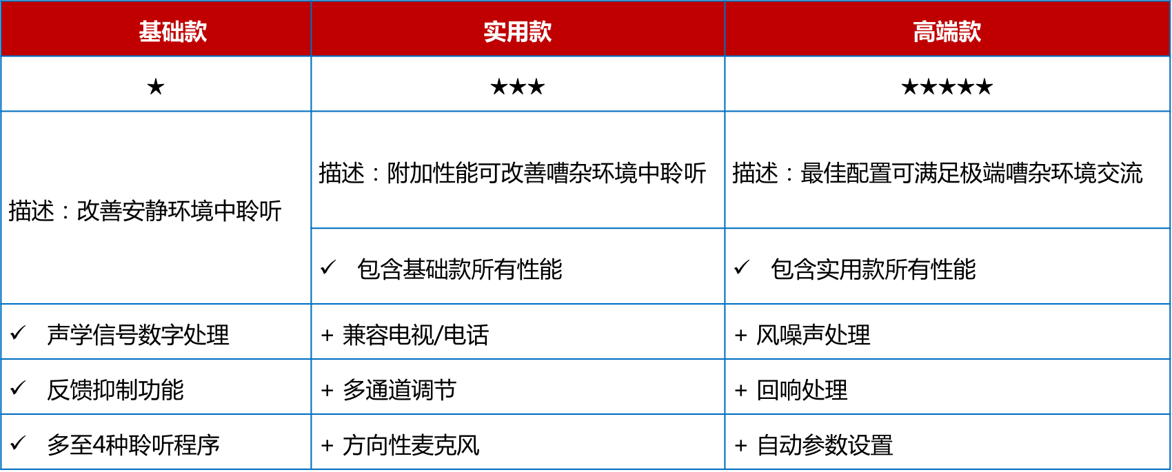 <span style="font-size:16px;"> 助聽器價格取決于機器的檔次,而檔次由內含的技術種類決定。助聽器檔次大致可分為基礎款、實用款、高端款。這三種檔次的區別請參見下表:</span></p><p style="text-align: center;"><span style="font-size:16px;"><img src="/upfiles/201808150226553383.png" width="640" alt="" /><br /></span></p><p><span style="font-size:16px;"> 那么,如何應該選擇哪種檔次的助聽器呢?</span></p><p><span style="font-size:16px;"> 選擇助聽器時主要需要考慮兩大因素。首先要考慮的就是弱聽人士的聽力損失程度,其次要考慮的就是弱聽人士的日常生活方式。比方說,某位弱聽人士是中度聽力損失,日常在家為主,那么實用款檔次助聽器通常可以滿足TA的需求。</span></p><p><span style="font-size:16px;"> 當然,這里只是為助聽器選配提供了大致方向,如何選配仍然需要具體情況具體分析,最好還是需要跟驗配師面對面溝通。</span></p><p><span style="font-size:16px;"> 1、高端款助聽器</span></p><p><span style="font-size:16px;"> 不同廠家的高端款助聽器均代表了各自的尖端技術,并致力于提供最佳的音質。</span></p><p><span style="font-size:16px;"> 這類助聽器高端之處在于自動適應各種聆聽環境,最優化佩戴者的聆聽清晰度和舒適度,讓佩戴者在極度嘈雜的環境中,如咖啡館,也能清晰地聽到同伴的言語聲。常見性能包括:</span></p><p><span style="font-size:16px;"> (1) 多種外觀、顏色可選;</span></p><p><span style="font-size:16px;"> (2) 環境自適應;</span></p><p><span style="font-size:16px;"> (3) 360°信號追蹤;</span></p><p><span style="font-size:16px;"> (4) 兼容各種藍牙設備。</span></p><p><span style="font-size:16px;"> 高端款助聽器為什么能夠自動適應各種聆聽環境呢?這是因為左右兩側的高端款助聽器能夠相互“通電報”,精準判斷所處的聆聽環境并自主學習,給出最佳的助聽設置。</span></p><p><span style="font-size:16px;"> 比如,您經常出入一家書店,每次您進入這家書店時總是習慣性地將音量調低2分貝;長此以往,當您再次進入該書店時,兩臺助聽器將會默契地降低2分貝。</span></p><p><span style="font-size:16px;"> 360°信號追蹤可以幫助佩戴者建立更佳的空間感知,對所處環境有充足的把控和預判,避免一些潛在的危險。而當助聽器連接至各種藍牙設備時,聆聽清晰度會更高,且不會打擾其他人。</span></p><p><span style="font-size:16px;"> 比如家人總是抱怨您把電視機聲音開得太大,拒絕跟您一起觀看電視時,您可以選配能夠兼容電視的助聽器,并進行獨立的音量調節,而家人只需設置為常規音量即可。高端款助聽器的價位一般在15000以上。</span></p><p style="text-align: center;"><span style="font-size:16px;"><img src="/upfiles/201808150228328500.jpg" alt="" /><br /></span></p><p><span style="font-size:16px;"> 2、實用款助聽器</span></p><p><span style="font-size:16px;"> 實用款助聽器的價格一般在8000~15000之間。實用款助聽器包含一定的降噪技術和言語提升功能,可以滿足大多數環境中的聆聽需求。部分廠家的實用款助聽器也可兼容各種藍牙設備。實用款助聽器的突出性能大致包括:</span></p><p><span style="font-size:16px;"> (1) 可連接外接音源;</span></p><p><span style="font-size:16px;"> (2) 言語清晰度提升;</span></p><p><span style="font-size:16px;"> (3) 方向性功能。</span></p><p><span style="font-size:16px;"> 3、基礎款助聽器</span></p><p><span style="font-size:16px;"> 基礎款助聽器的價位一般在8000以下。基礎款助聽器能夠滿足安靜環境中的交流需求,并具備反饋管理功能。反饋管理功能能夠有效提升佩戴舒適度,避免在日常佩戴過程中出現尖銳的干擾聲。</span></p><p><span style="font-size:16px;"> 基礎款助聽器適用于經常在家的弱聽人士,若是生活方式比較豐富多彩的弱聽人士建議選配其他檔次的助聽器。實用款助聽器的突出性能大致包括:</span></p><p><span style="font-size:16px;"> (1) 數字信號處理技術;</span></p><p><span style="font-size:16px;"> (2) 反饋管理功能;</span></p><p><span style="font-size:16px;"> (3) 多種聆聽程序可選。</span></p><p><span style="font-size:16px;"> 更多詳情請登錄www.hnghng.cn。</span></p>" />