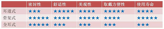 通過以下對照表可以了解耳道式、骨架式、全耳式的優缺點。
