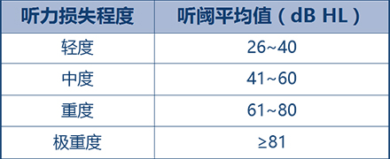 聽力損失的程度有輕有重,可分為輕、中、重和極重度四等。世界衛生組織(WHO)推薦以相對好耳的500Hz、1000Hz、2000Hz和4000Hz 這4個頻率聽閾的平均值來評估。聽閾的數值越大,聽力損失相對越重。聽力損失的程度不同,所適用的助聽器功率不同,助聽器外形也可能有所不同。