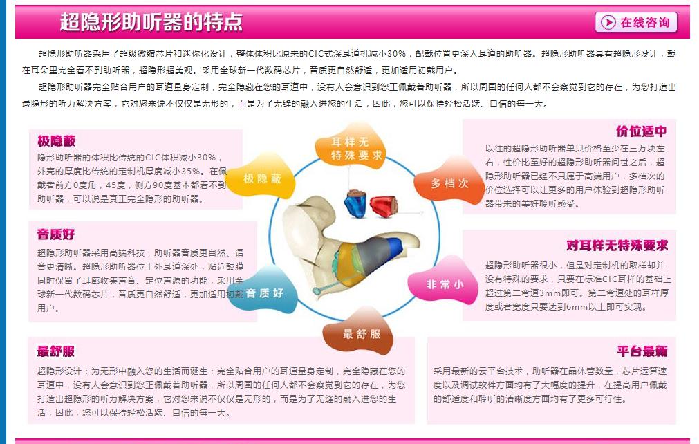 外形和性能近乎完美結(jié)合,“隱形”的特性極為迷人。隱形助聽器屬于高端機(jī)型,一般價(jià)格都不會(huì)低,至少上萬元,不過其帶來的美好聆聽感受是無與倫比的。